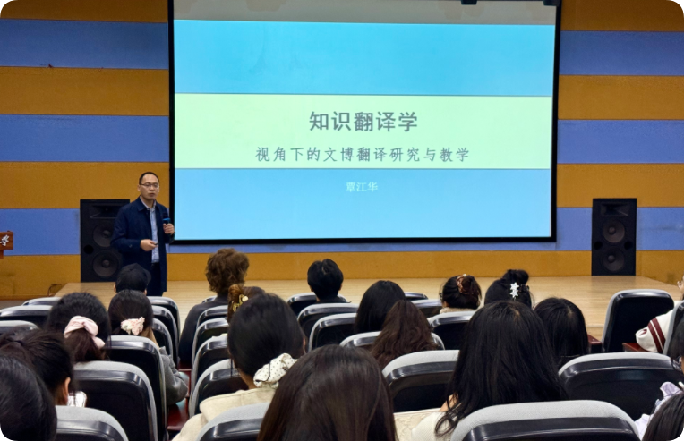 随后,覃教授从“知识翻译学”“翻译是人学”及“感官翻译”等前沿理论视角出发,结合故宫博物院、大英博物馆等场馆的文博翻译实例,进行了深入浅出的讲解。他指出,知识翻译学视域下的文博翻译强调具身体验、多感官参与和动态生成的重要性。此外,他还分享了如何利用人工智能技术赋能文博翻译实践,并结合教学经验,生动展示了AI作为辅助工具在提升翻译效率与创新性方面的作用。