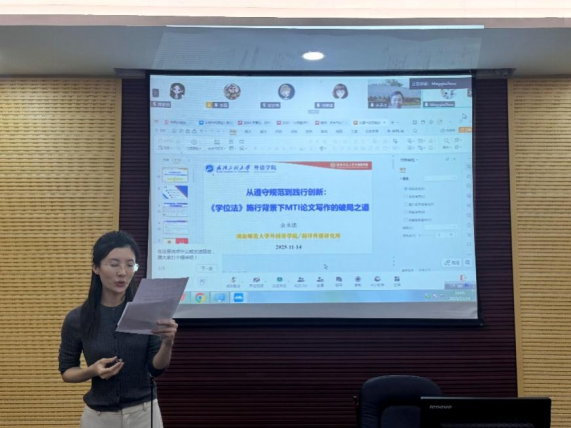 (通讯员:周晓威)2025年11月14日下午,由402cc永利官网研究生院与402永利集团联合主办的“研究生创新学术论坛”顺利举行。本次论坛采用线上直播、线下集中观看的方式开展,特邀湖南师范大学“潇湘学者”特聘教授、翻译(学)博士生导师余承法教授作专题报告,题为“从遵守规范到践行创新:《学位法》施行背景下 MTI 论文写作的破局之道”。本次讲座由周晓威老师主持,402永利集团教师代表及2024级MTI研究生在文科楼117报告厅集体参与了本次学术活动。