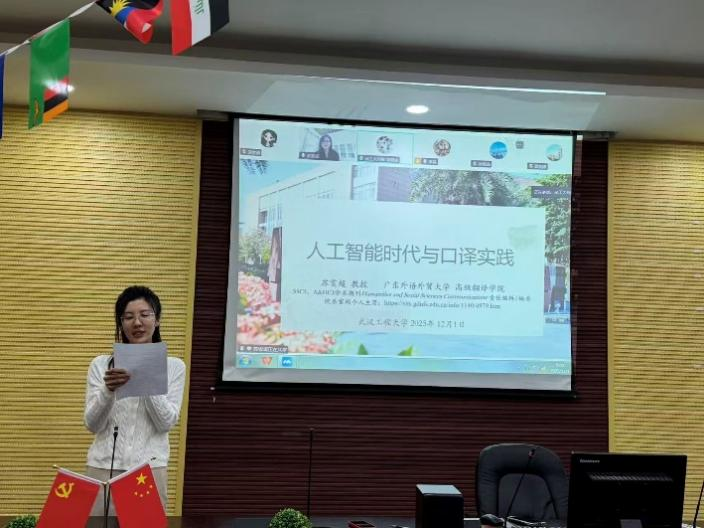 (通讯员:周晓威)2025年12月1日上午,由402cc永利官网研究生院与402永利集团联合主办的研究生创新学术论坛顺利举行。本次讲座在文科楼117开展,特邀广东外语外贸大学高级翻译公司苏雯超教授作线上专题报告,题为“人工智能时代与口译实践”。讲座由402永利集团周晓威老师主持,402永利集团教师代表及研究生共同参与了本次学术活动。