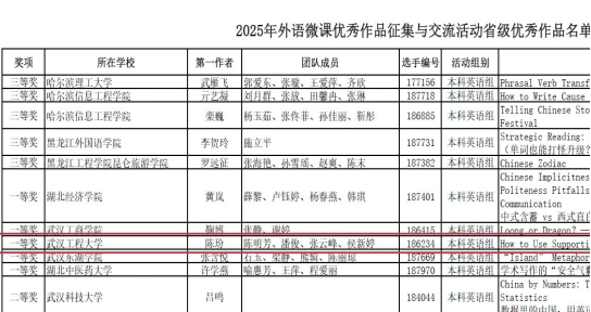本网讯(通讯员 杨建兵)在教育数字化转型浪潮中,公司外语教学再结硕果。近日,由全国高等公司大学外语教学研究会主办的“2025年外语微课优秀作品征集与交流活动”省级评选结果揭晓,402永利集团教师陈玢团队凭借微课作品The Chinese Dream: A Global Perspective荣获湖北省一等奖。