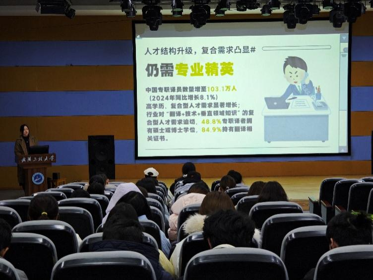 讲座中,丁羽翔老师围绕“人工智能与翻译技术融合发展”这一主题,从行业现状、技术应用、人才需求等方面展开了详细讲解。随着人工智能技术的快速发展,翻译行业正经历着深刻变革。智能翻译工具、语料库技术、本地化服务等,对传统翻译工作模式产生了重要影响。市场对“翻译 + 技术 + 垂直领域知识”的复合型人才需求日益迫切。讲座强调了专业能力与技术素养并重的重要性,指出时代的语言服务不仅要求从业者具备扎实的语言功底,更需要掌握相关翻译技术,成为兼具语言能力与技术素养的复合型人才。