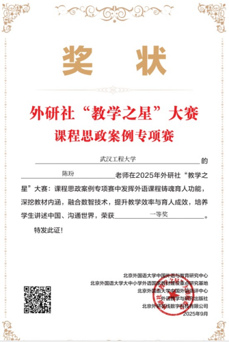 As the golden autumn ushers in the season of gratitude for teachers, the results of the 2025 FLTRP Teaching Star National Competition — Curriculum Ideology and Politics Case Category were announced on Teachers’ Day, September 10. Professor Chen Bin from the College of Foreign Languages at Wuhan Institute of Technology stood out from more than 2,000 submissions nationwide with her innovative teaching practice in the course College English A3, winning the National First Prize.